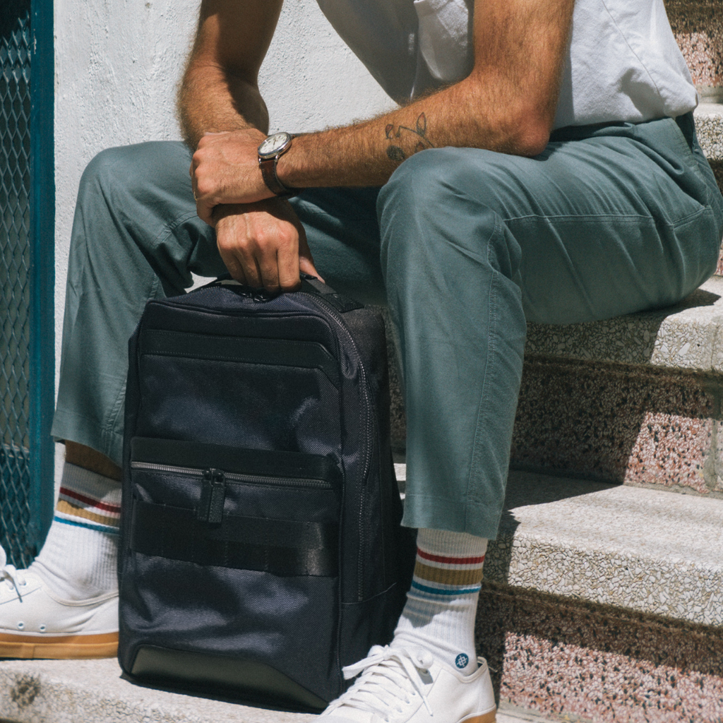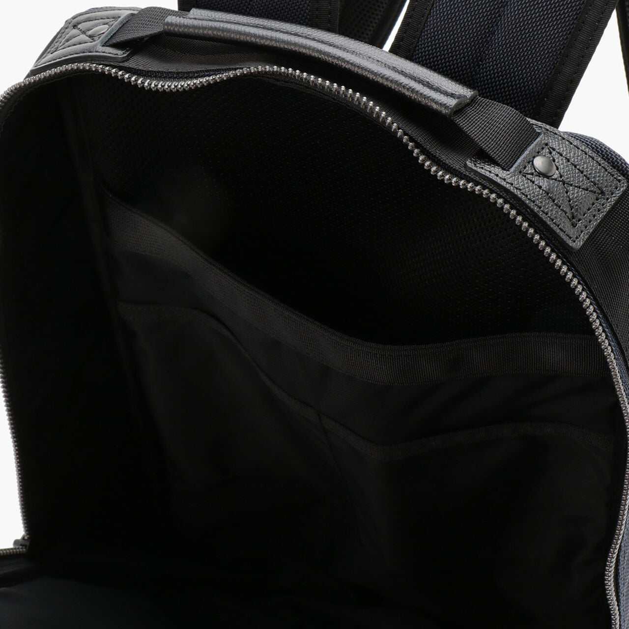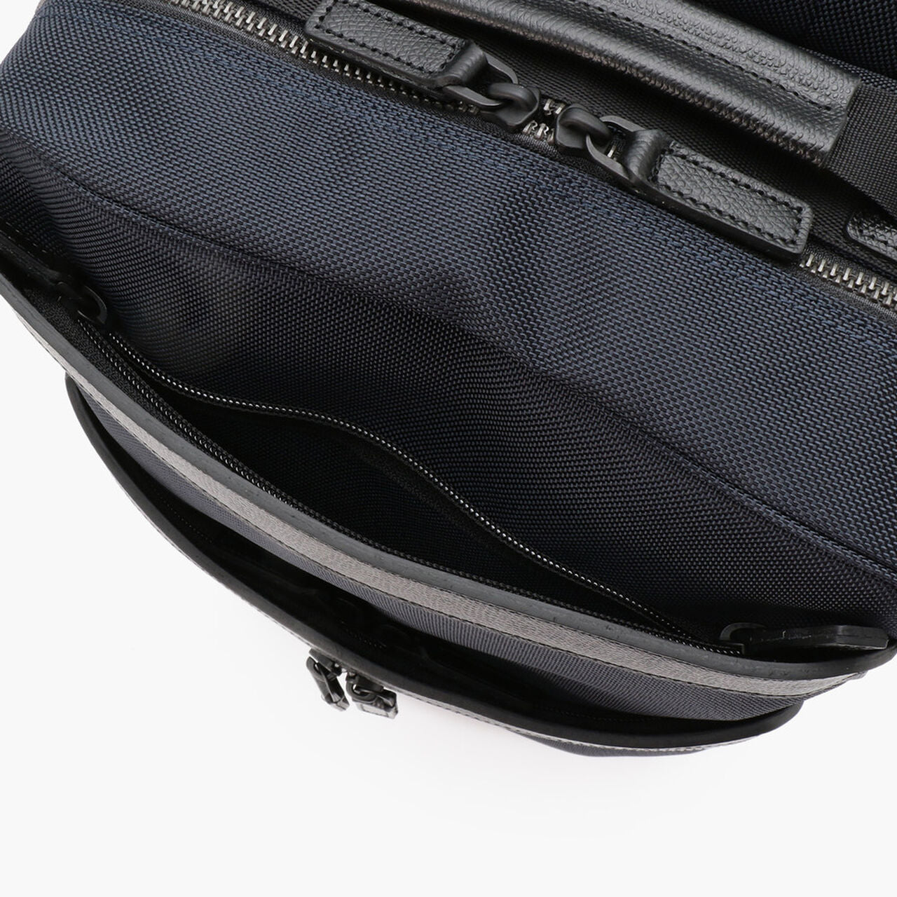 このFUSION COLLECTIONのバックパックは、防水レザーと高密度ナイロンで作られています。tile 仕事にもプライベートにも使えるアイテム。ファイルなども収納しやすいスクエア型のシルエットです。内外のポケットはビジネスツールと私物を分けてスマートに収納できるよう設計されています。バッグには防水レザーと、タイヤの芯などに使われる耐久性と耐摩耗性に優れた1680デニールナイロンを使用しています。赤のラインを入れずワントーンにすることで異素材の組み合わせを際立たせています。