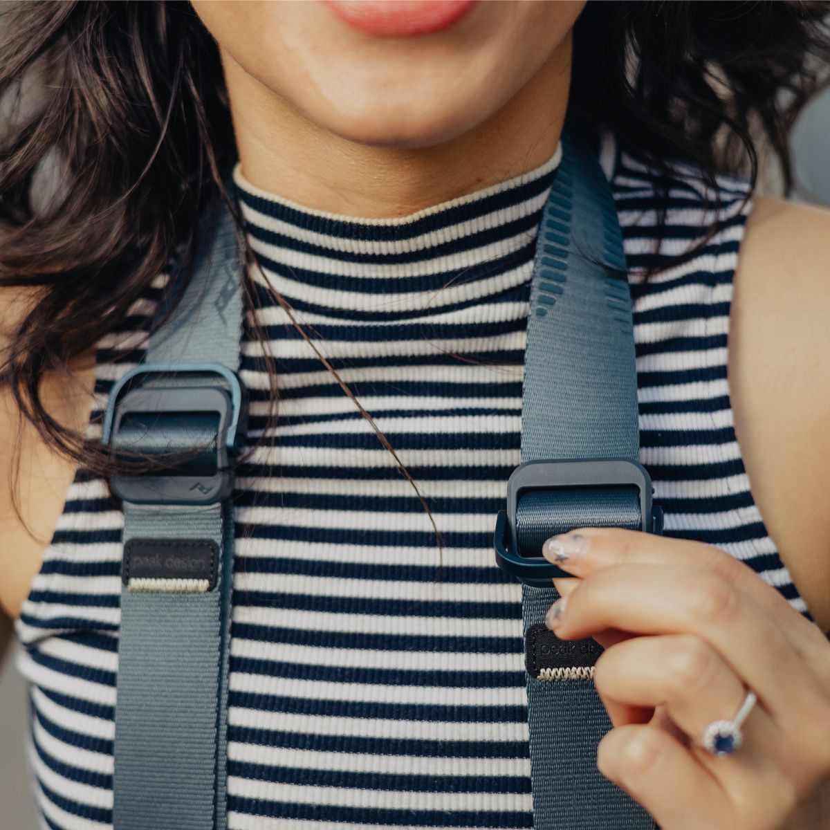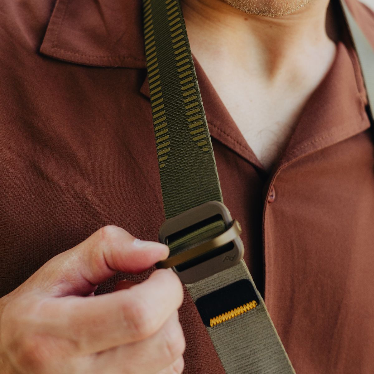2つのクイックプルアジャスターにより、幅広い長さ調節が可能。ウェビングが衣服の上を滑るように動き、カメラに素早くアクセスできます。